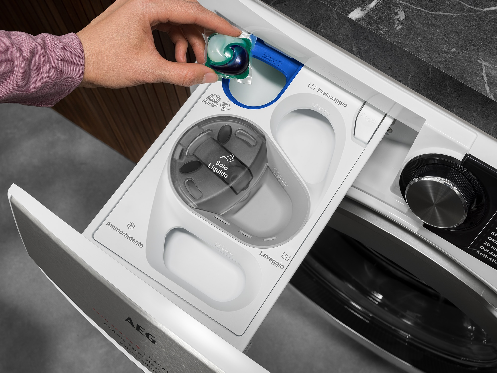 Il nuovo cassetto delle lavatrici UniversalDose di AEG ha un design brevettato che permette l'efficace dissoluzione di tutti i tipi di detersivo, comprese le PODS®. La potenza pulente del detersivo è garantita anche nei lavaggi brevi e a basse temperature.