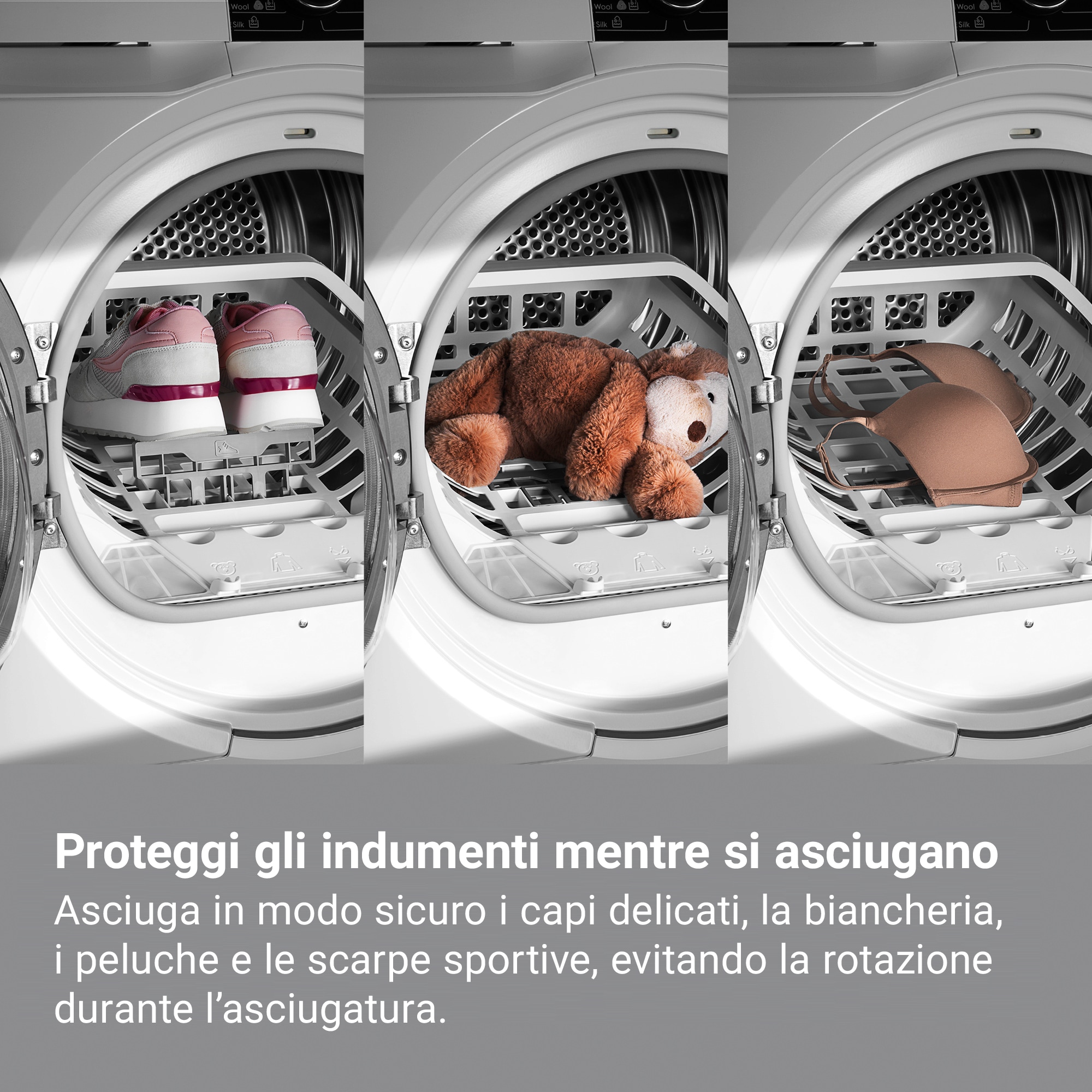 Il cestello per l'asciugatura asciuga i capi delicati senza danneggiarli. Posizionalo nel cestello per asciugare capi delicati come maglioni in lana, camicette in seta o peluche in tutta sicurezza.