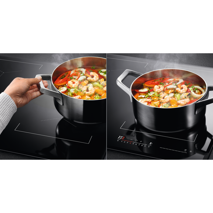 Piano cottura a induzione extrapiatto da 80 cm TotalFlex ActiveTouch Serie 6000 con 6 zone cottura a induzione totale con rilevamento pentole fino a 35 cm, comandi intuitivi con riconoscimento automatico delle zone, funzione Bridge, sistema Hob2Hood, pannello touch scorrevole con potenza da 0 a 9, blocco di sicurezza e funzione PowerBoost, timer e funzione pausa