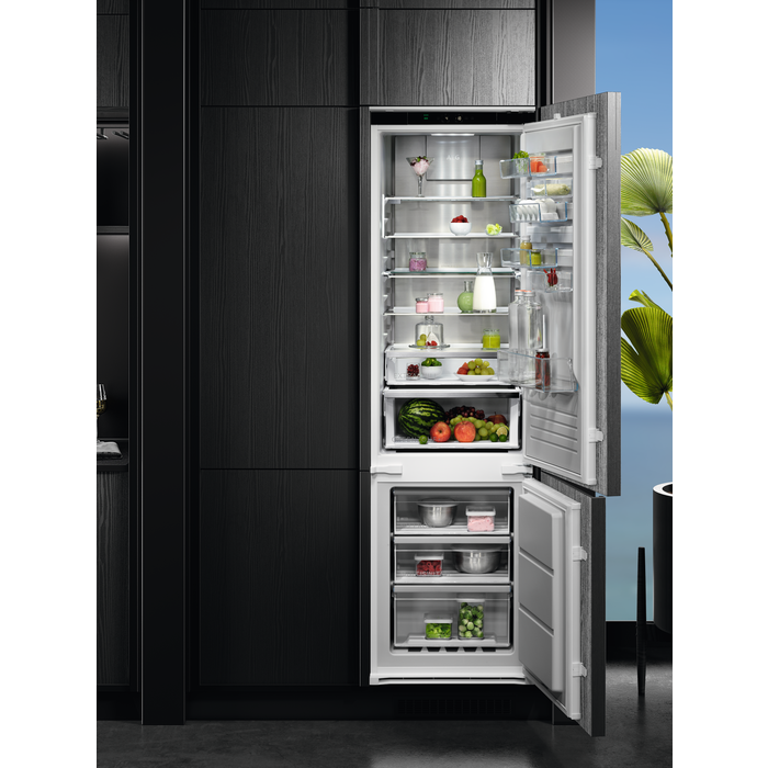 Il frigocongelatore Cooling 360° serie 8000 è dotato di più canali d'aria per garantire un raffreddamento costante. In questo modo si proteggono gli alimenti su ogni ripiano e si riduce lo spreco di cibo del 28%*. L'acciaio inox dona alla cucina un aspetto elegante e raffinato.