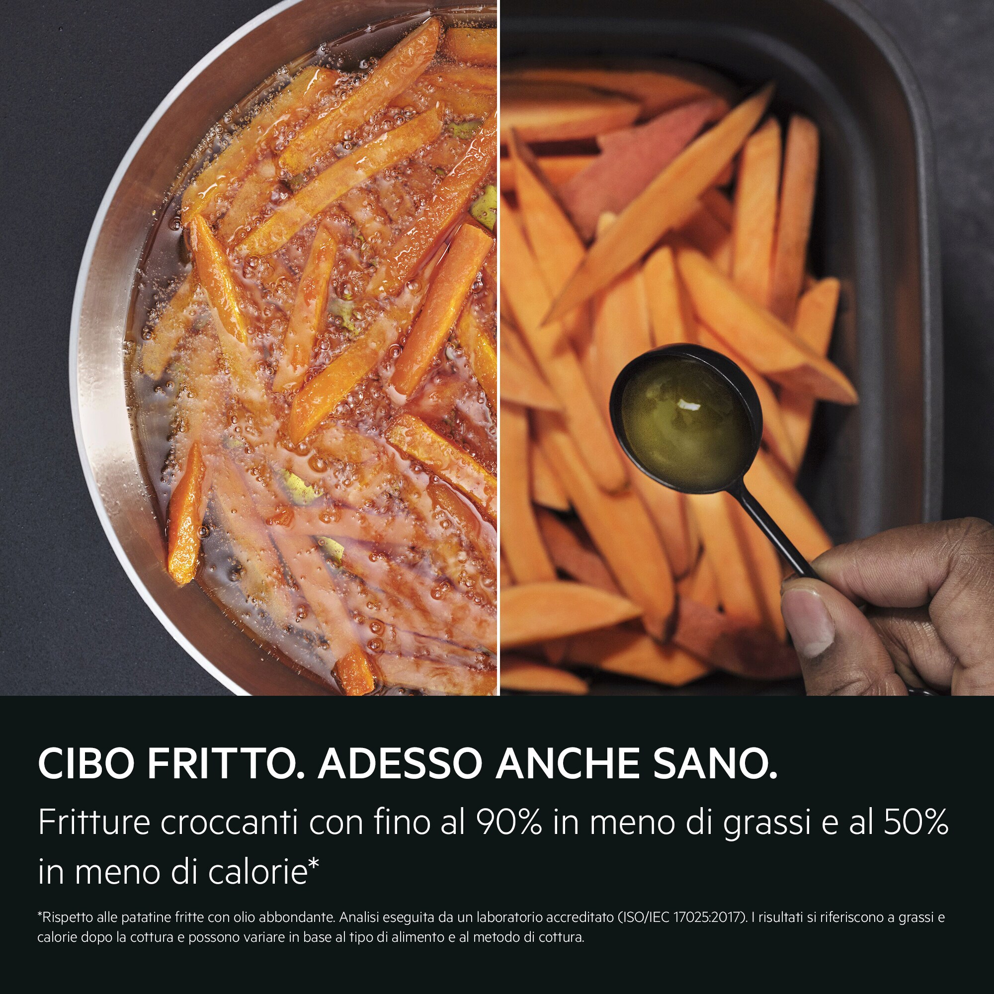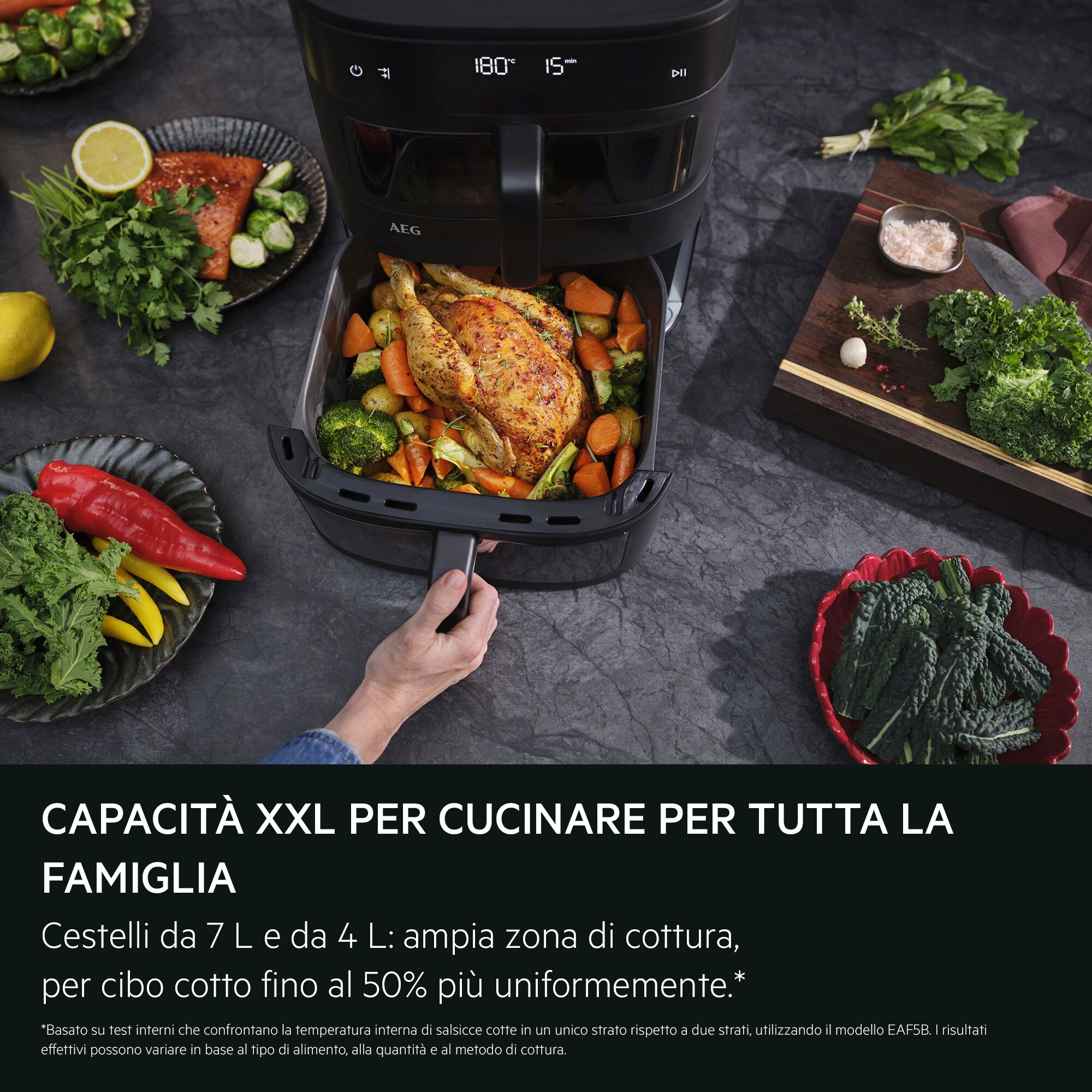 **Basato su test interni che confrontano la temperatura interna di salsicce cotte in un unico strato rispetto a due strati, utilizzando il modello EAF5B. I risultati effettivi possono variare in base al tipo di alimento, alla quantità e al metodo di cottura.