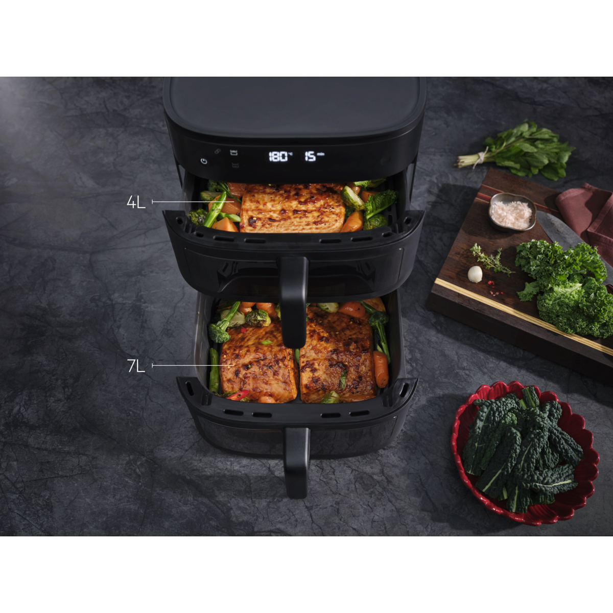 Basket capacity: 11L (7L bottom, 4L top)