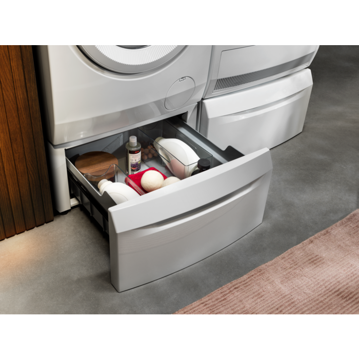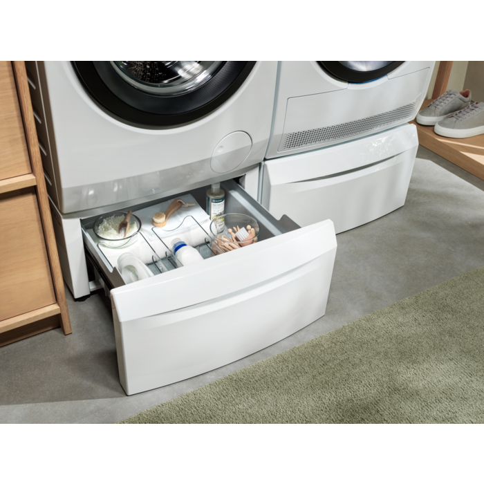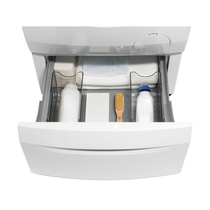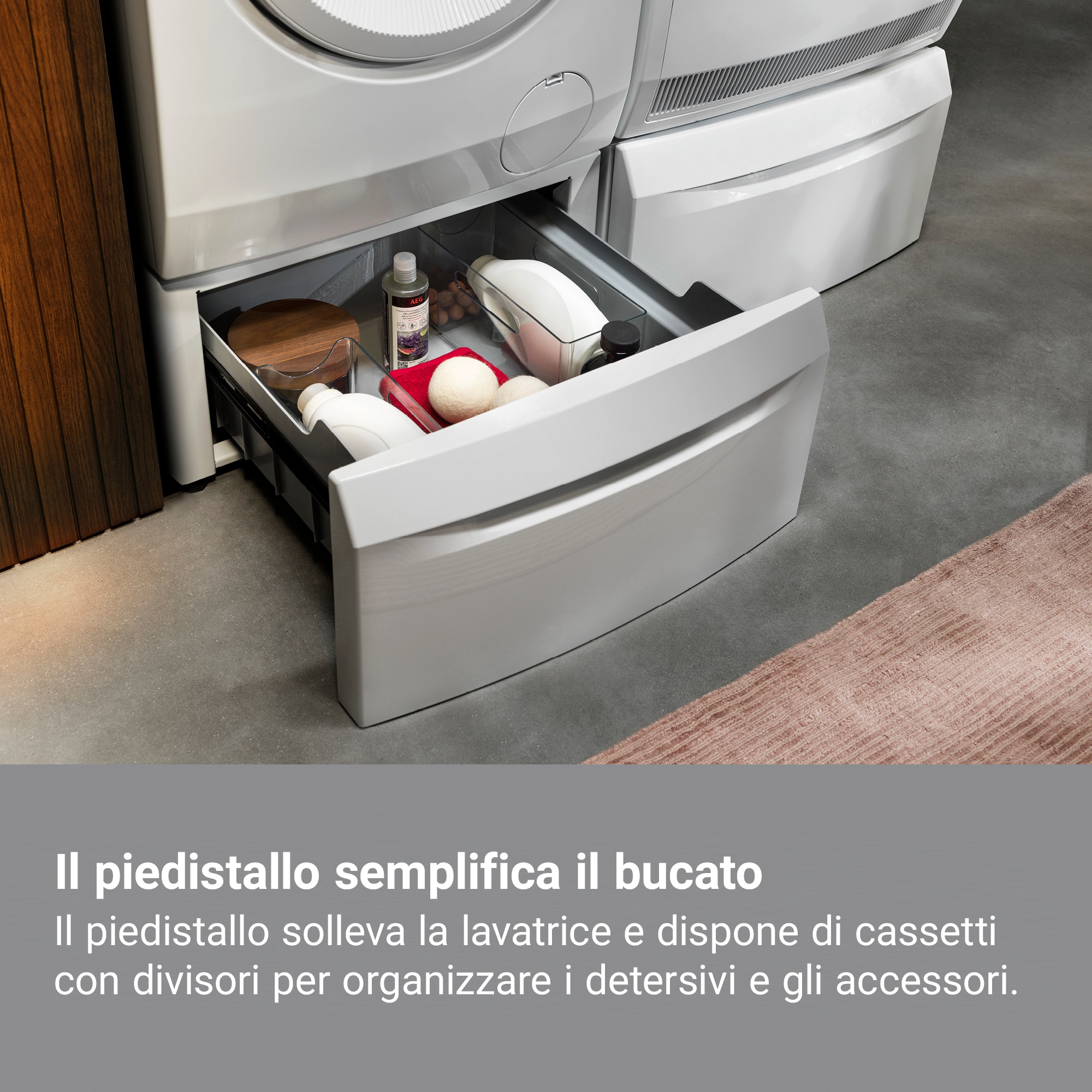 Questo spazio in più da posizionare sotto l'asciugatrice, ti permette di avere spazio extra per riporre tutto gli accessori utili mentre fai il bucato, e portare l'asciugatrice a un'altezza più comoda per essere utilizzata.