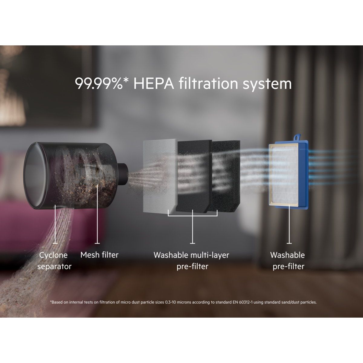 *Basato su test interni sulla filtrazione di particelle di polvere microscopiche da 0,3 a 10 micron secondo lo standard EN60312-1 utilizzando particelle di sabbia/polvere standard.